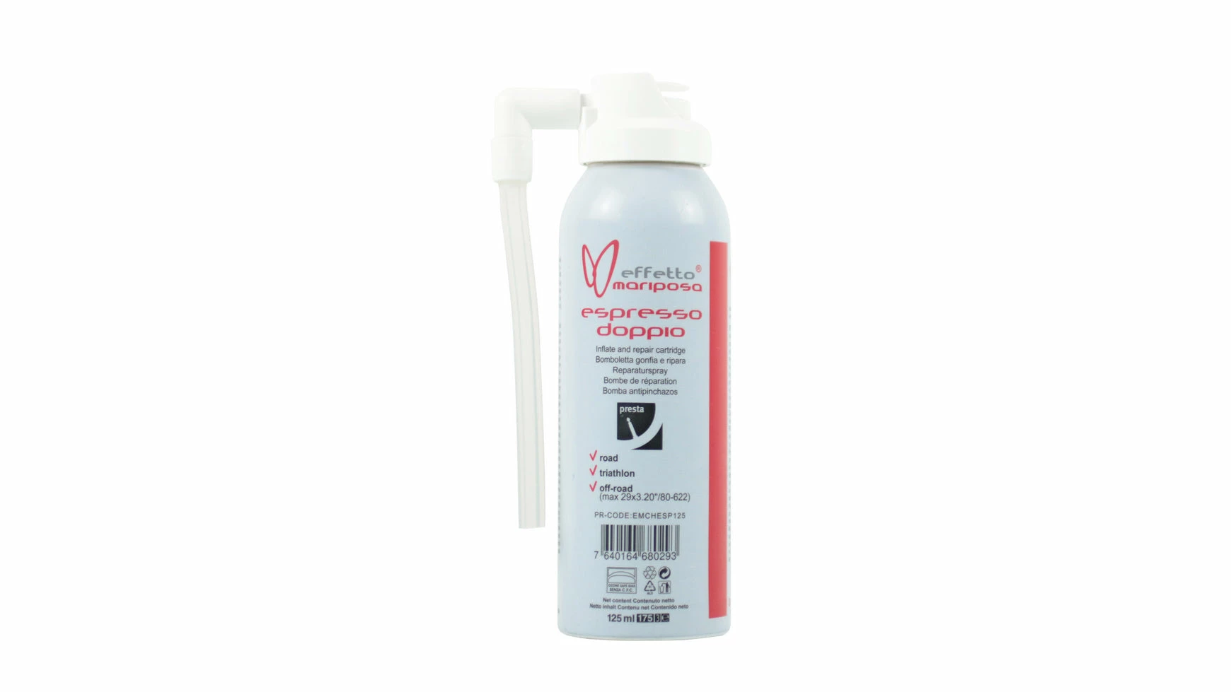 Mariposa Pannen – Reparaturspray Espresso Doppia 125 ml Mit dem Mariposa Pannen u. Reparaturspray verlieren Reifenpannen Ihre Schrecken. Besonders bei E-Bikes ist es oft mit viel Aufwand verbunden, eine Reifenpanne schnell und ohne Anstrengung zu beheben. Das Mariposa Espresso Doppia verschliesst Löcher von bis zu 1mm und pumpt den Reifen gleichzeitig auf. Einfach das Pannenspray auf das Sclaverand Ventil schrauben und fertig.