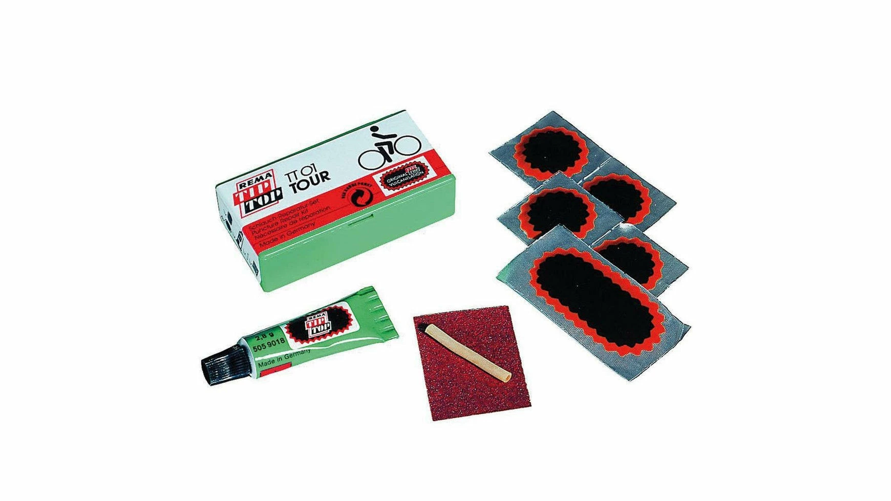 Inhalt: 4 kleine und ein großer Flicken, Gummilösung, Schmirgelpapier, Ventilschlauch.
