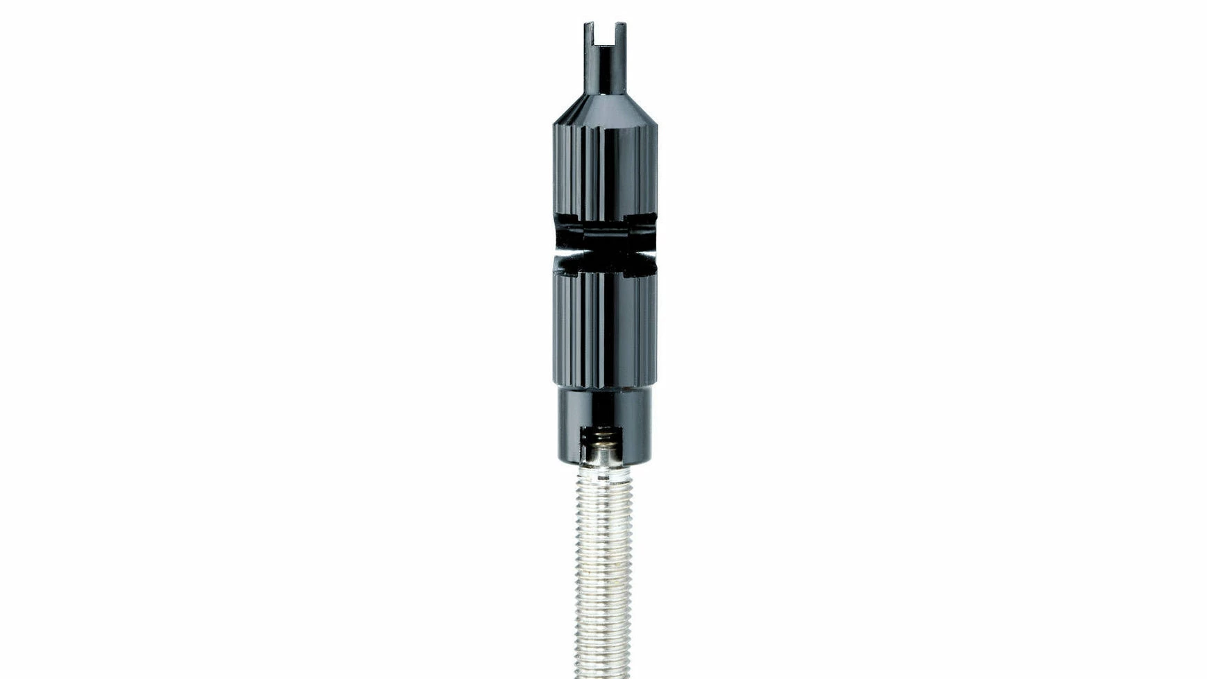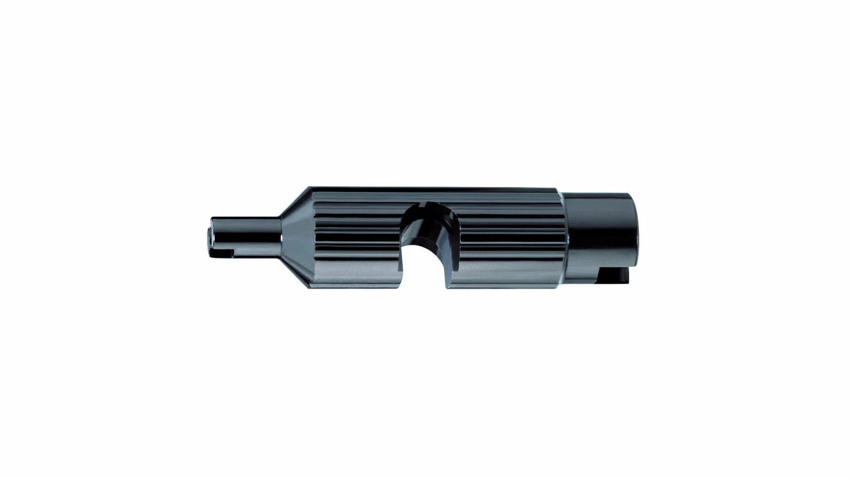 Aus hochwertigem Metall gefertigtes Ventil-Werkzeug mit dem sich Schrader und zweiteilige Presta Ventileinsätze festziehen und lösen lassen. Dank der speziellen Form lassen sich auch Presta Ventilverlängerungen festziehen und lösen.
